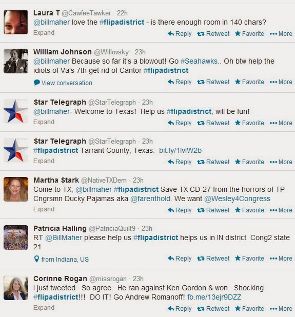 We've been tweeting up a storm, seems Bill Maher has offered to help some lucky town #flipadistrict. They will pick a "lemon" congressperson and make visits to the district and report on them. Ongoing. On National TV. We have R's and D's tweeting for Tarrant County. It takes a village to toss a lemon.